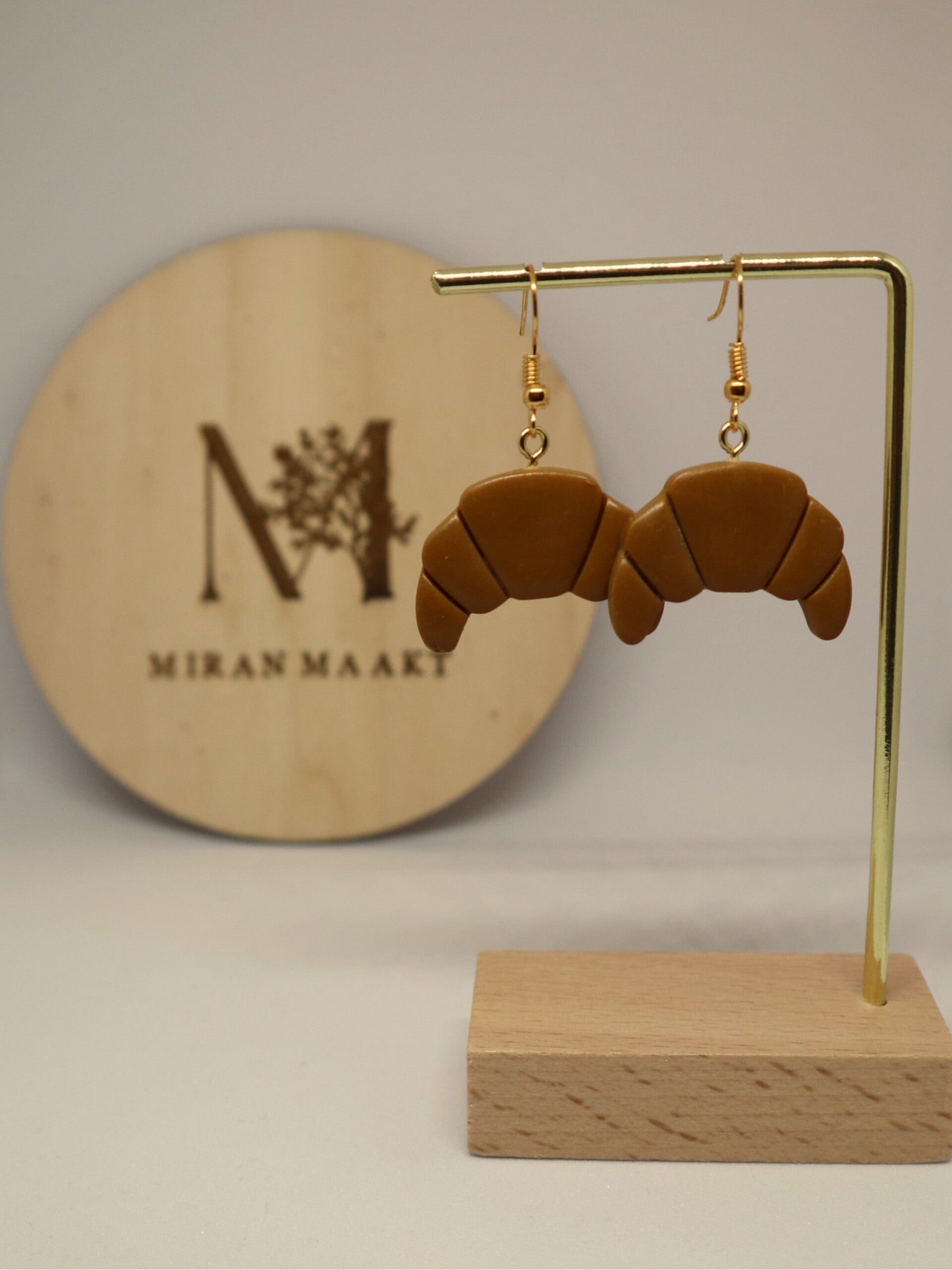 Polymeer oorbellen aan goudkleurige hangers. Deze oorbellen hebben een leuke croissant vorm. Door de materiaalkeuze zijn ze licht in gewicht