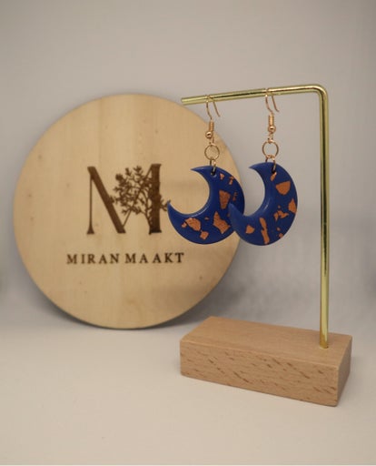 Deze diepblauwe maantjes met rosé accenten zitten aan goudkleurige hangers. De oorbellen zijn gemaakt van polymeerklei en daarom licht in gewicht.
